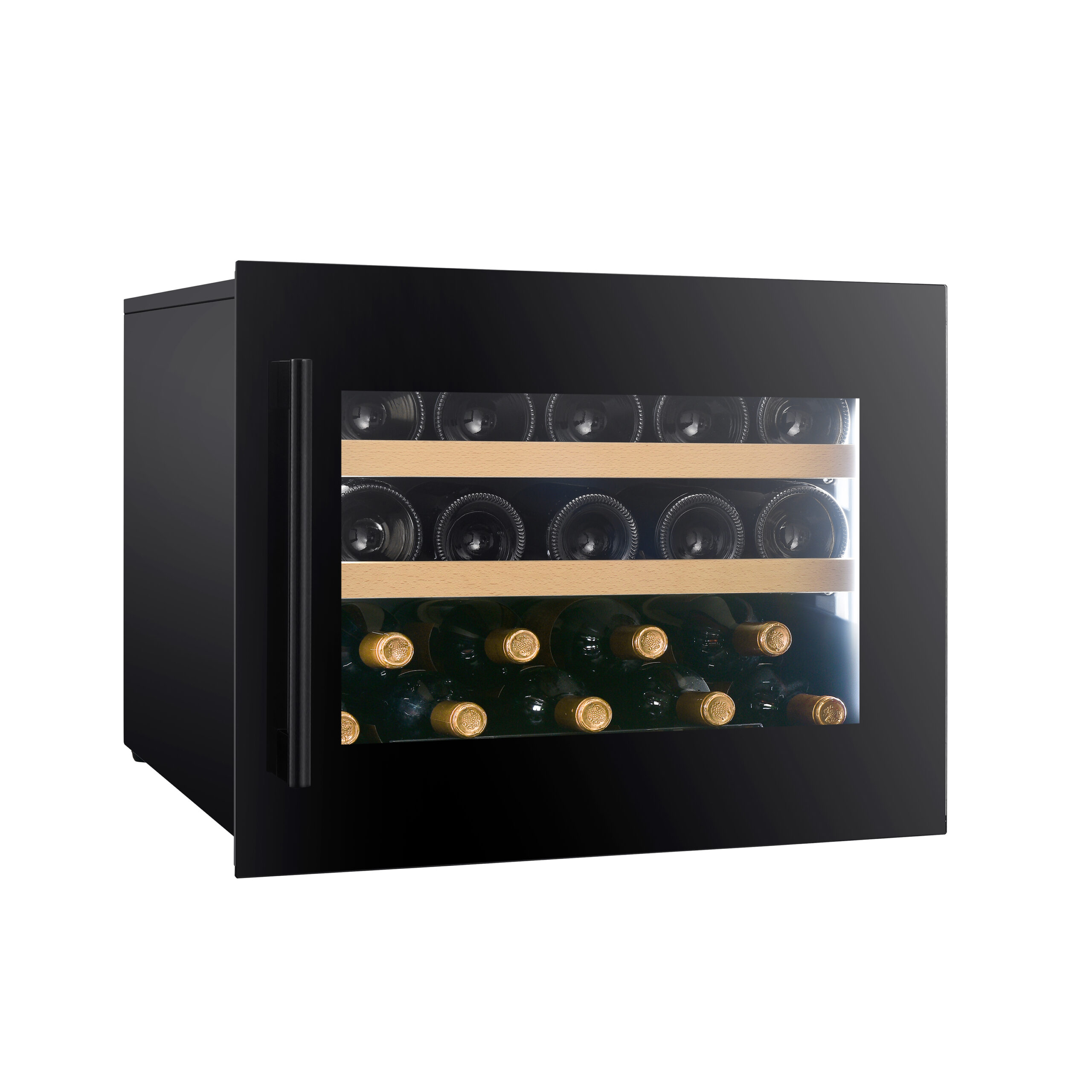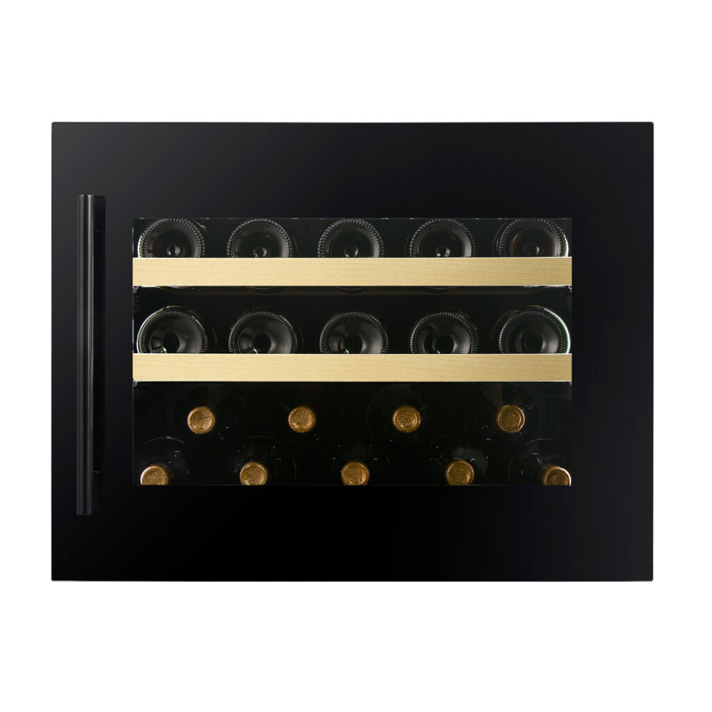 Potpuno ugradana vinska vitrina za 19 boca sa crnim okvirom vrata i jednom zonom hlađenja.