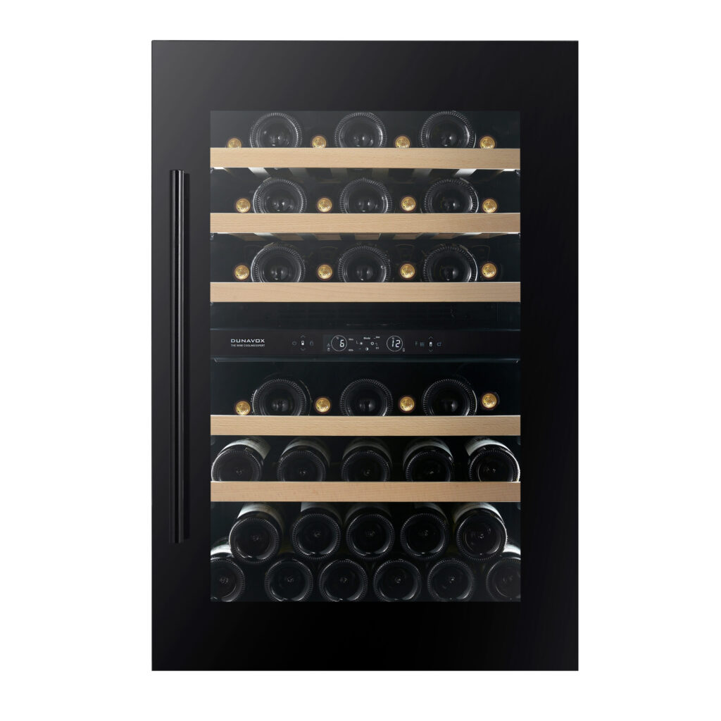 Potpuno ugradana vinska vitrina za 49 boca sa crnim okvirom vrata i dve zone hlađenja.
